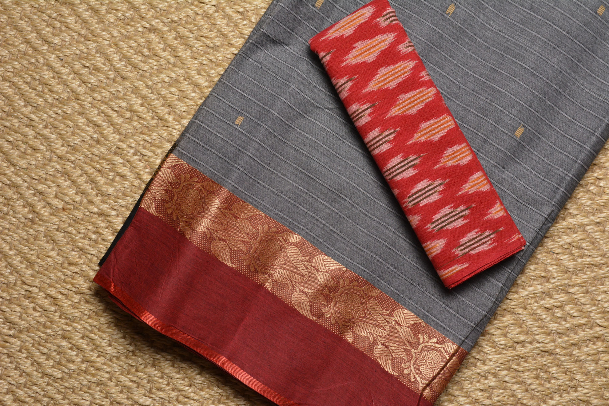 Grey bengal cotton saree with black and maroon ganga jamuna border with a ikkat blouse fabric