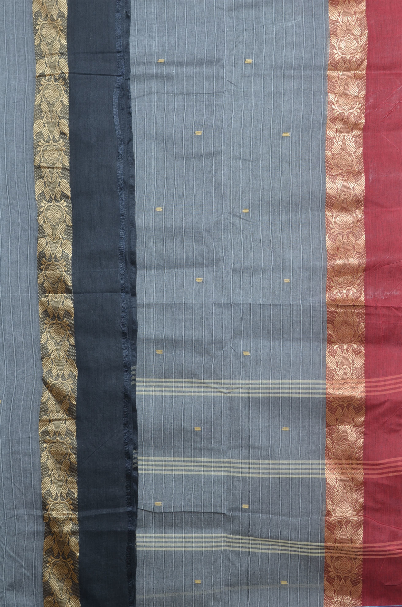 Grey Bengal Cotton Saree with Black and Maroon Ganga Jamuna Border