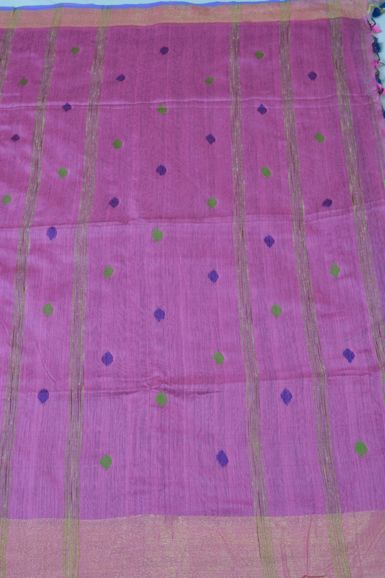 Sweet grey jamdani silk saree with jamdani butta all over the body. Gold zari border and baby pink jamdani pallu render a beautiful look to the saree. It comes with an attached pink blouse piece. These sarees are typically light in weight, giving an excellent comfort and look.