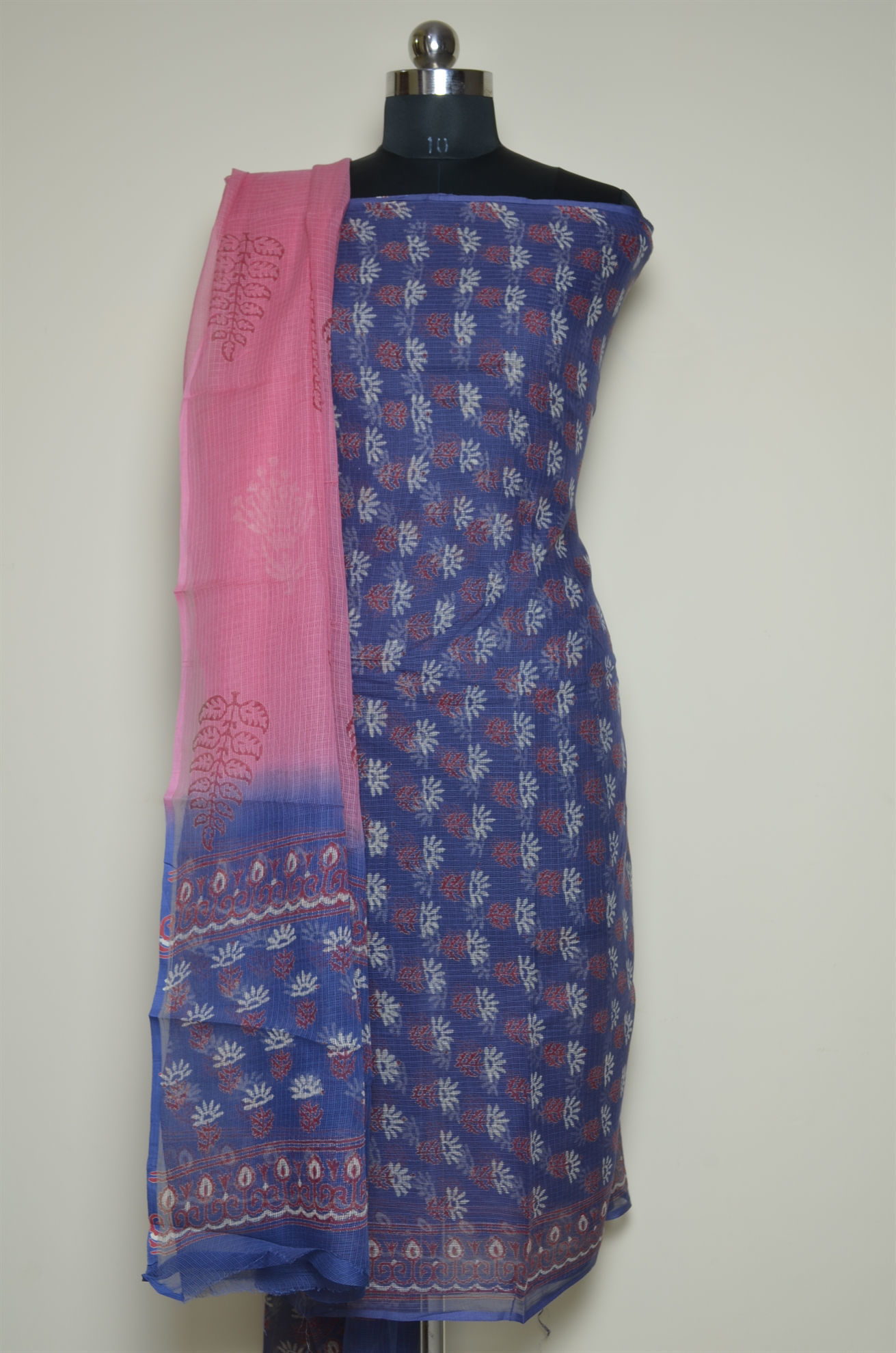Prussian Blue and Peach Floral Munga Kota Doria Dress Material
