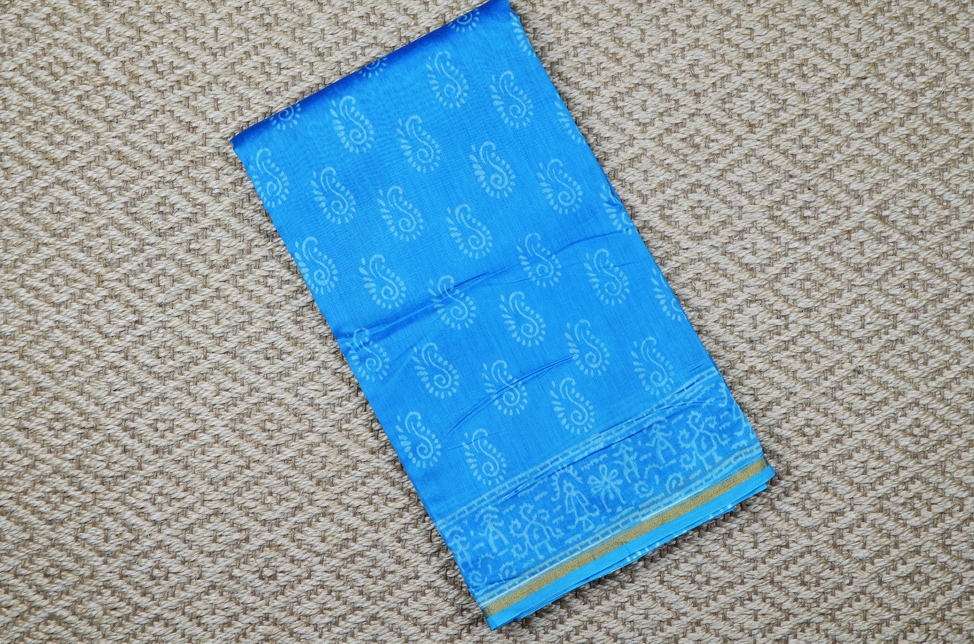 Sky Blue Handblock Print Chanderi Silk Saree with Small Zari Border