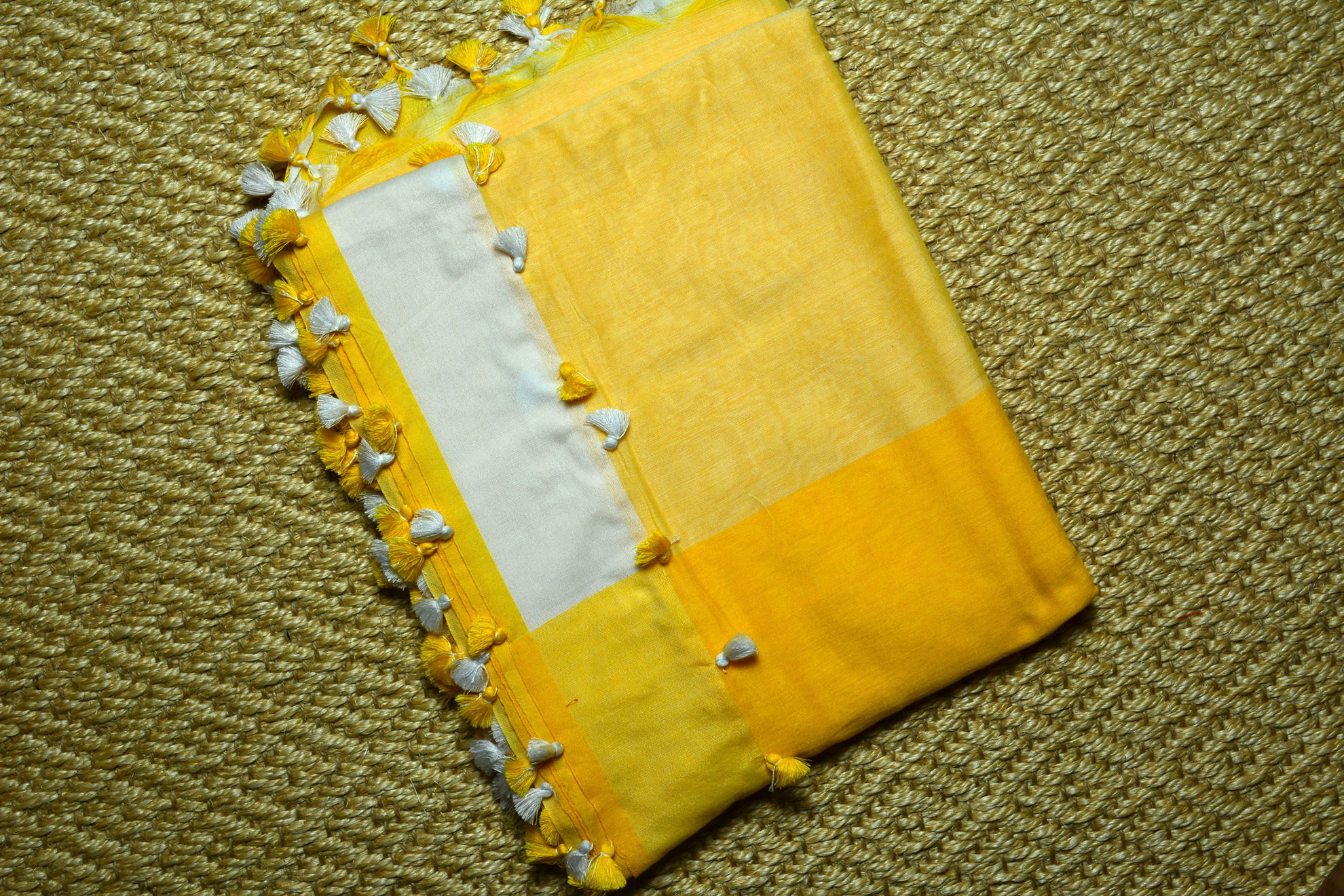 Yellow and white soft cotton handloom saree with pom pom work and a blouse